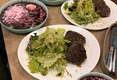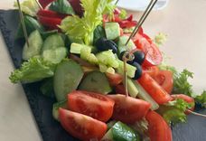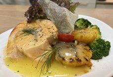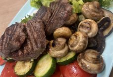 400 г • Говяжьи щечки, запеченный картофель, маринованный огурчик, лесные шампиньоны, черри, микс салат, медово-горчичная заправка