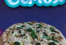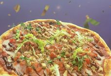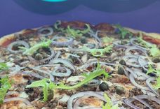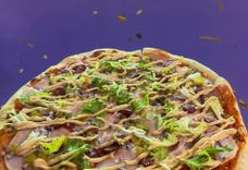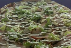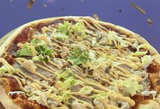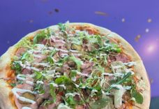 800 г • Соус из томатов, моцарелла, ветчина, бекон, шампиньоны, лук крисперс, огурчик маринованный, чесночный соус