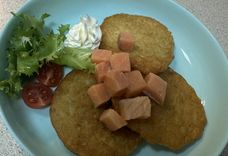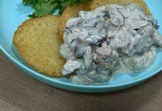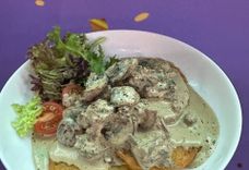 400 г • Картофельные драники с томленой говядиной, шампиньонами, в соусе сливочный демиглас