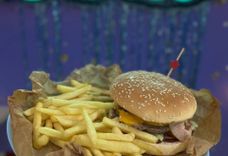 450 г • Крафтовая булка, 2 котлеты из говядины, томаты, крымский лук, микс салат, чеддер, соус барбекю, битый огурец, соус сырный, халапеньо, картофель фри