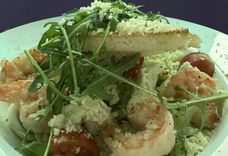 350 г • Айсберг, королевские креветки, томаты, перепелиное яйцо, гренки, соус «Цезарь»