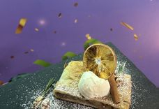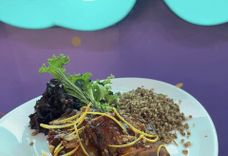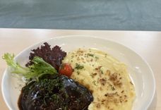 550 г • Вафля из картофеля, томленая говядина, лесные шампиньоны, микс салата, соус демиглас, лук крисперс