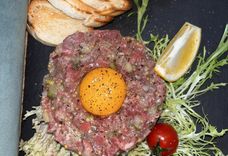 300/100/30 г • Говяжья вырезка, каперсы, красный лук, корнишоны, яйцо, французская горчица, гренки