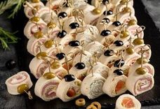 Канапе «По-провански» 8 шт (сыр, ветчина, маслина, маринованный огурец), канапе «Неаполь» 8 шт (тостовый хлеб, творожный сыр, пепперони, кукуруза бейби, маслина), рулетики из тортильи : с цыпленком и соусом Терияки, с цыпленком и соусом цезарь, с ветчиной и сырным соусом, с лососем и соусом терияки , канапе с креветкой 8 шт, брускетты с лососем 6 шт, брускетты с парижской ветчиной