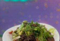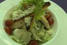350 г • Айсберг, курица гриль, томаты, перепелиное яйцо, гренки, соус «Цезарь»